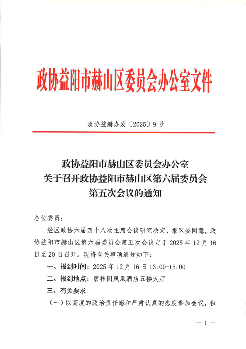 关于召开政协益阳市赫山区第六届委员会第五次会议的通知