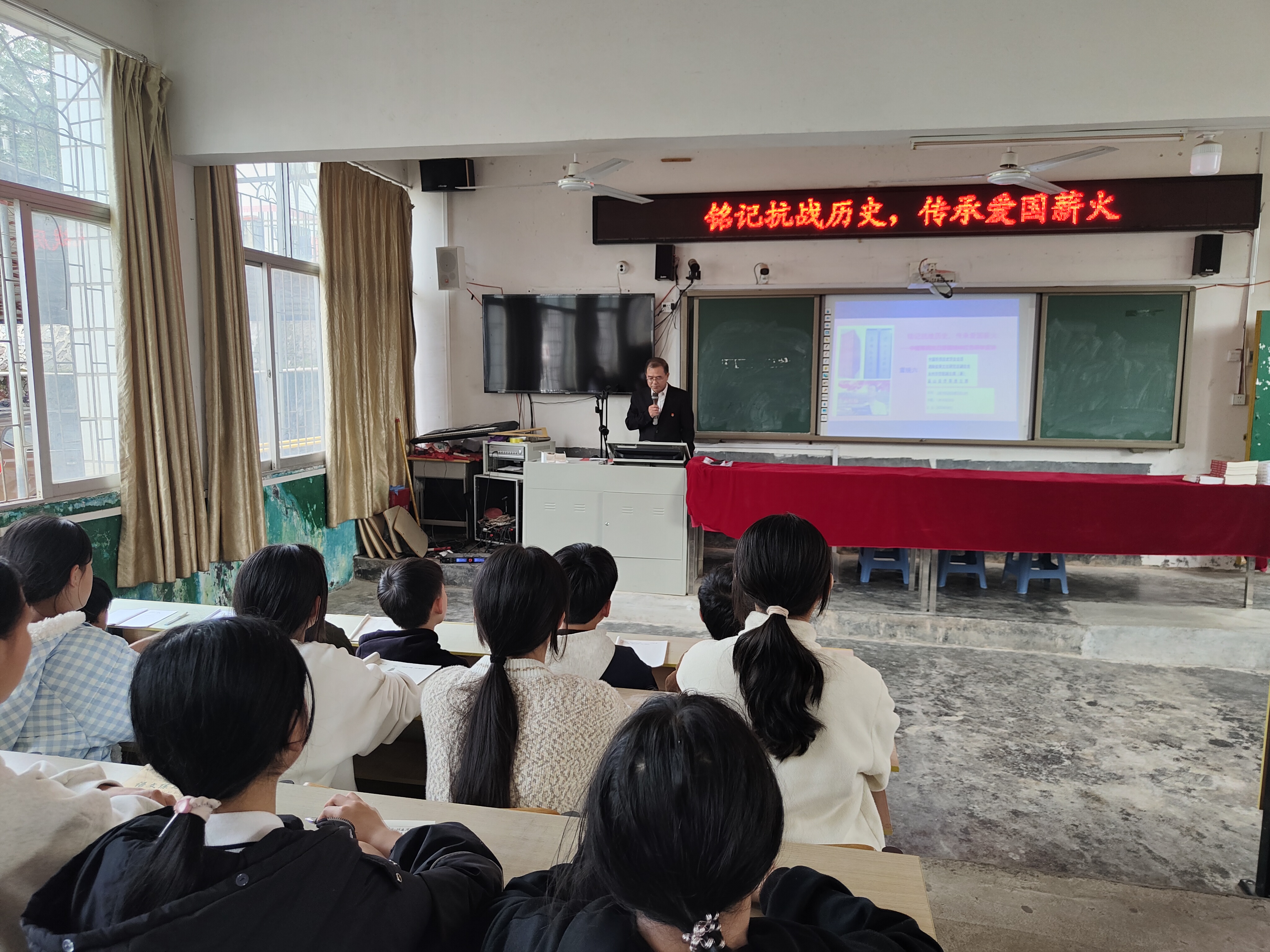 为厚植青少年爱国情怀,传承红色基因,扎实落实立德树人根本任务,近日,《铭记抗战历史,传承爱国薪火》红色研学思政课在蓝山县毛俊中学多功能报告厅正式开讲。此次活动由毛俊学校校长蒋校长盛情邀请,特邀蓝山县原侨联主席雷统六担任主讲人,全校100余名师生将现场聆听学习。