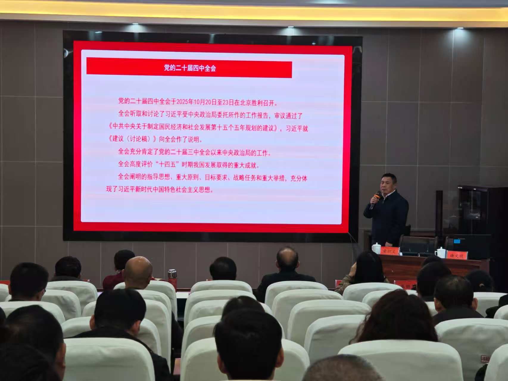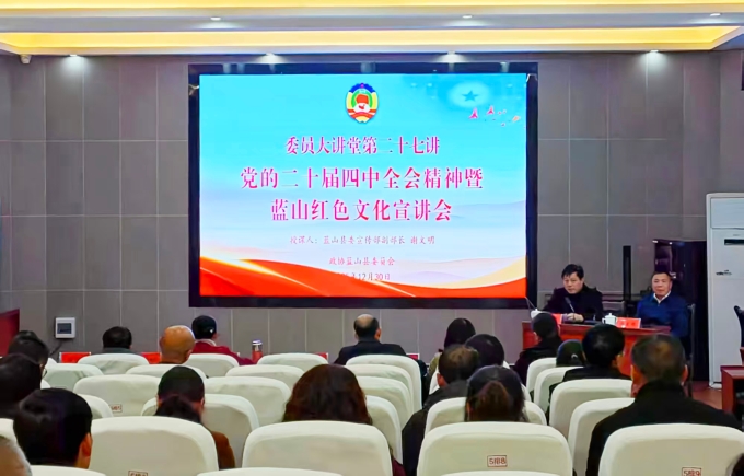 此次活动邀请了县委宣传部副部长谢文明以“贯彻落实党的二十届四中全会精神,弘扬蓝山‘开放包容、敢为人先’精神”为主题作宣讲。活动中,谢文明循着历史脉络,深入讲述了红色基因浸润“三蓝”大地的千年历程,并对“开放包容、敢为人先”的蓝山精神进行了深度解读。