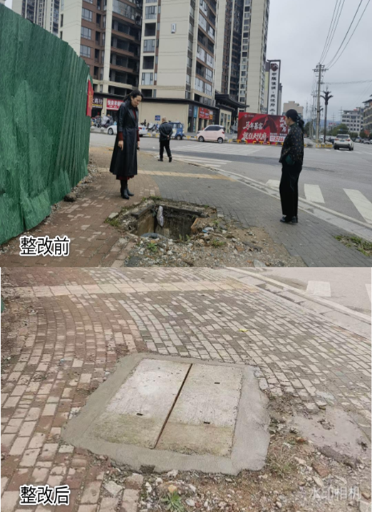 第二天(2月28日)上午九点,刘素萍主席带领县政协办、县城管局、经开区、职业中专等单位负责人直奔“微尘”反映的两个问题现场。现场发现在职业中专与天悦府路口,一处电力井井盖缺失、管线裸露。在职业天桥旁湘粤北路边,只见一根斜伸的管道裸露在外,周边没有任何警示标识。这两处地方处于人口密集区,特别是学生经常路过的地方,确实存在很大的安全隐患,必须及时整改。城管局、自来水公司和职业中专主动接受任务,及时安排专人加班加点施工,两个安全隐患点于一天之内全部整改到位。