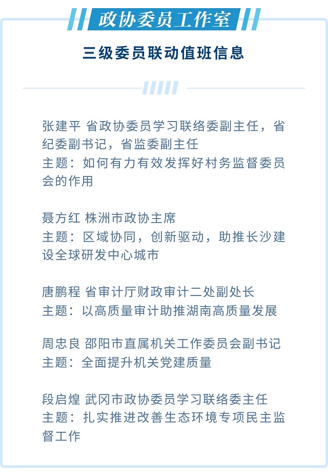 ① 政协融媒推出“添彩潇湘——改善生态环境专项民主监督优秀案例展示”系列报道:《多措并举助推生态环境改善丨优秀案例·醴陵市》详情 《探索河湖治理“三长+委员”工作模式丨优秀案例·靖州县》详情 《聚焦“天更蓝”,一线履职促提升丨优秀案例·新晃县》。详情