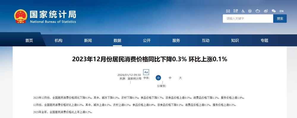2023年12月份居民消费价格同比下降0.3% 环比上涨0.1%