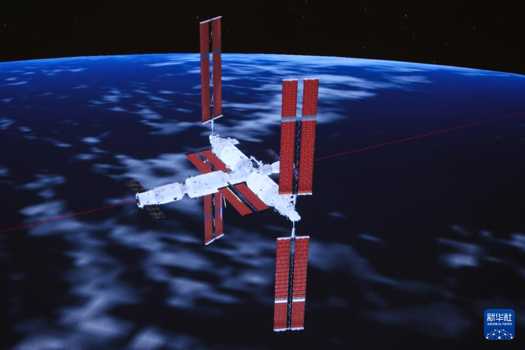 1月18日在北京航天飞行控制中心拍摄的天舟七号货运飞船与空间站组合体完成交会对接的画面。新华社发(韩启扬 摄)