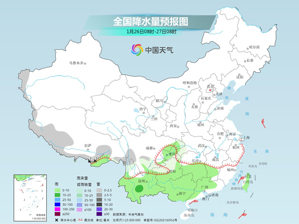 明天,新疆南疆西部山区、西藏东南部、川西高原南部、四川南部、云南西北部等地部分地区有小雪或雨夹雪,其中,西藏南部等地部分地区有大雪。江南南部、西南地区东部和南部、华南大部、台湾岛大部等地部分地区有小到中雨。