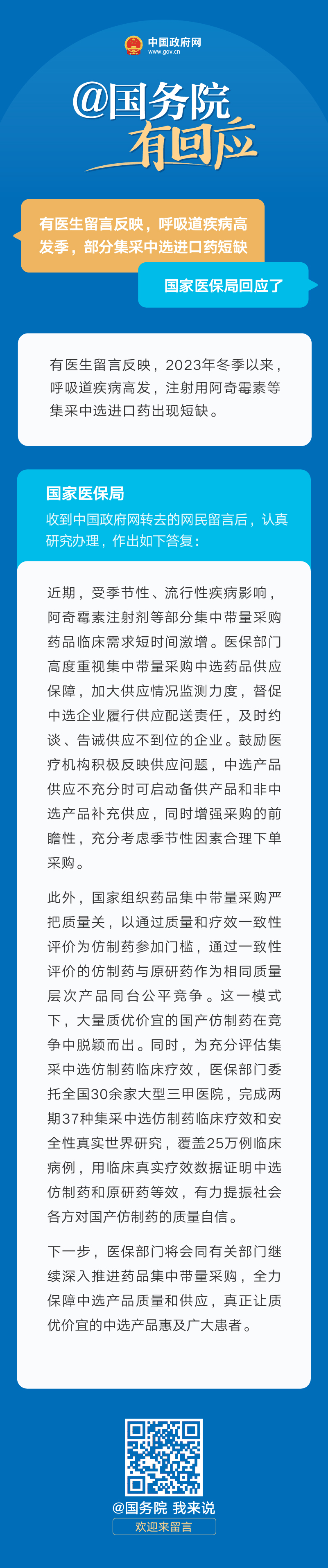 有医生留言反映,2023年冬季以来,呼吸道疾病高发,注射用阿奇霉素等集采中选进口药出现短缺。