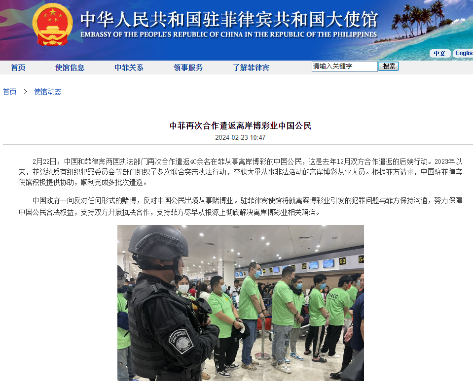 2月22日,中国和菲律宾两国执法部门再次合作遣返40余名在菲从事离岸博彩的中国公民,这是去年12月双方合作遣返的后续行动。2023年以来,菲总统反有组织犯罪委员会等部门组织了多次联合突击执法行动,查获大量从事非法活动的离岸博彩从业人员。根据菲方请求,中国驻菲律宾使馆积极提供协助,顺利完成多批次遣返。