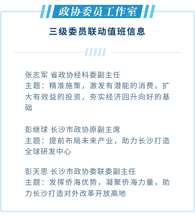 ⑤ 27日,湖南省政协经科委在湖南湘江新区开展“强化政策保障举措,支持民营经济高质量发展”主题线上线下值班活动,收集省市县三级政协委员和广大网友对民营经济高质量发展的意见建议。详情