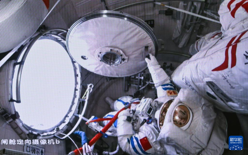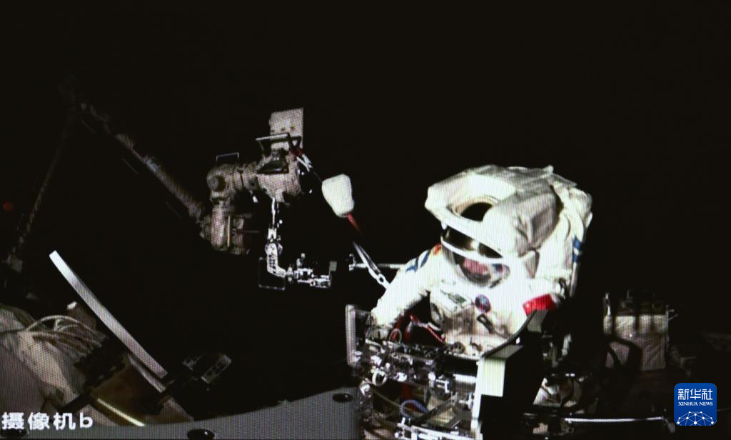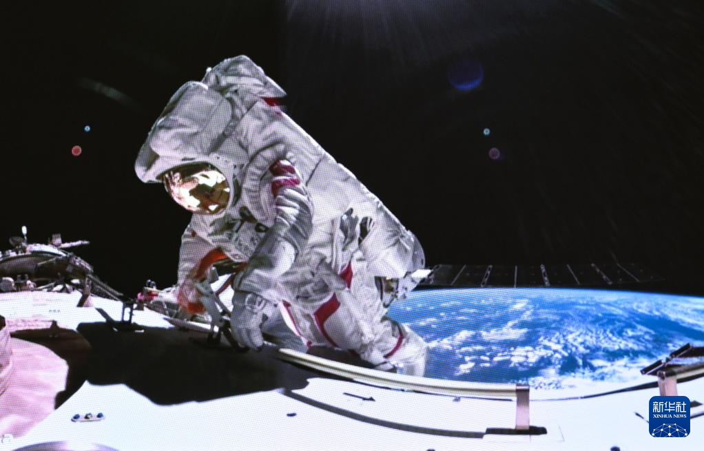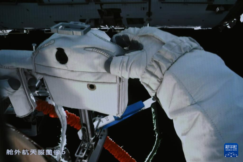 3月2日,在北京航天飞行控制中心拍摄的神舟十七号航天员江新林在空间站组合体舱外作业。新华社记者 李贺 摄