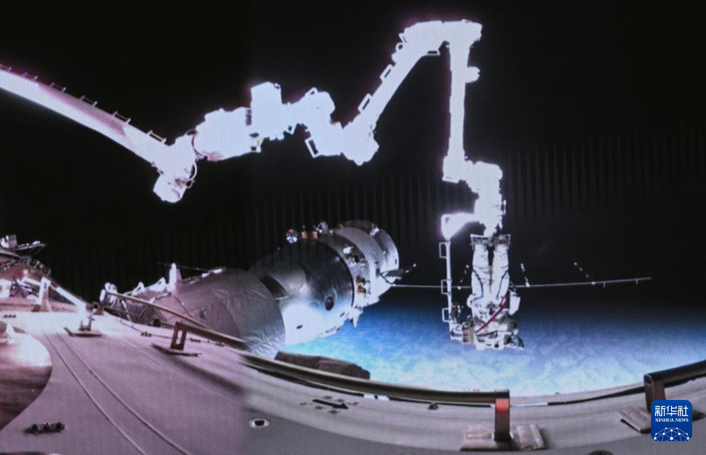 3月2日,在北京航天飞行控制中心拍摄的神舟十七号航天员江新林在空间站机械臂的辅助下进行舱外作业。新华社记者 李贺 摄