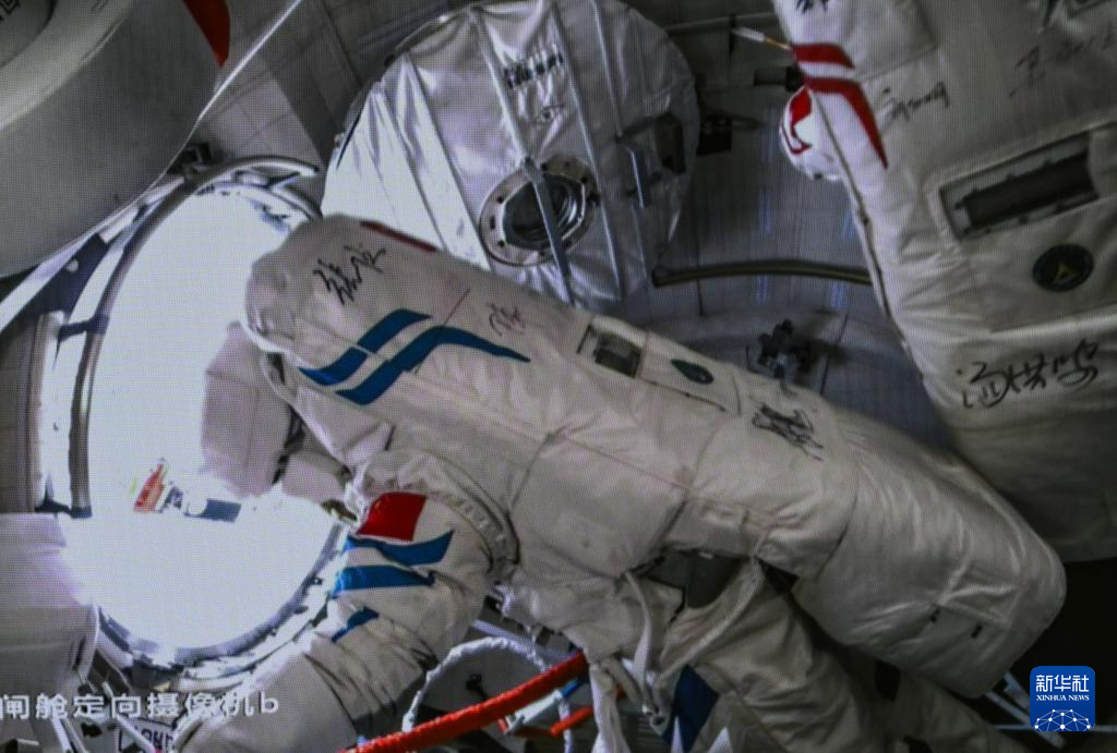 3月2日,在北京航天飞行控制中心拍摄的神舟十七号航天员在出舱作业前打开问天实验舱舱门。新华社记者 李贺 摄