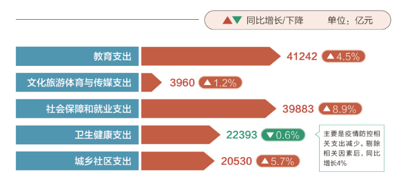 2023年,尽管财政收支压力很大,但民生投入力度不减。超过27万亿元全国一般公共预算支出中,教育、社会保障和就业支出都在4万亿元上下,卫生健康、城乡社区支出都超过了2万亿元。
