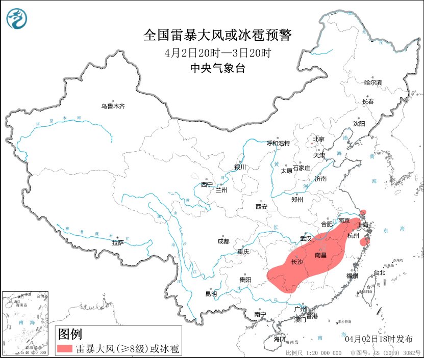 预计4月2日20时至3日20时,安徽南部、江苏南部、上海、湖北东南部、湖南东部和中南部、江西、浙江西部、福建西北部、广西东北部等地的部分地区将有10级以上雷暴大风或冰雹天气,局地风力可达12级以上,最大冰雹直径20毫米以上;安徽南部、江苏南部、上海、湖南东部和南部、江西、浙江西部、福建西部、贵州东南部、广西东北部、广东西北部等地的部分地区将有短时强降水天气,最大小时雨量30-50毫米,局地可达70毫米以上。预计,强对流的主要影响时段为今天夜间。