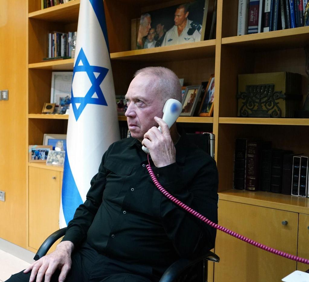 这张以色列国防部4月14日发布的照片显示,以色列国防部长加兰特与美国国防部长奥斯汀通电话。新华社发(以色列国防部供图)
