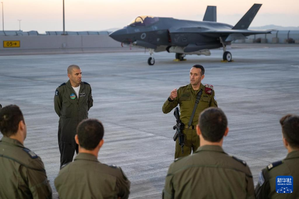 4月15日,以色列国防军总参谋长哈莱维(后右)在以色列南部的内瓦提姆空军基地讲话。新华社发(以色列国防军供图)