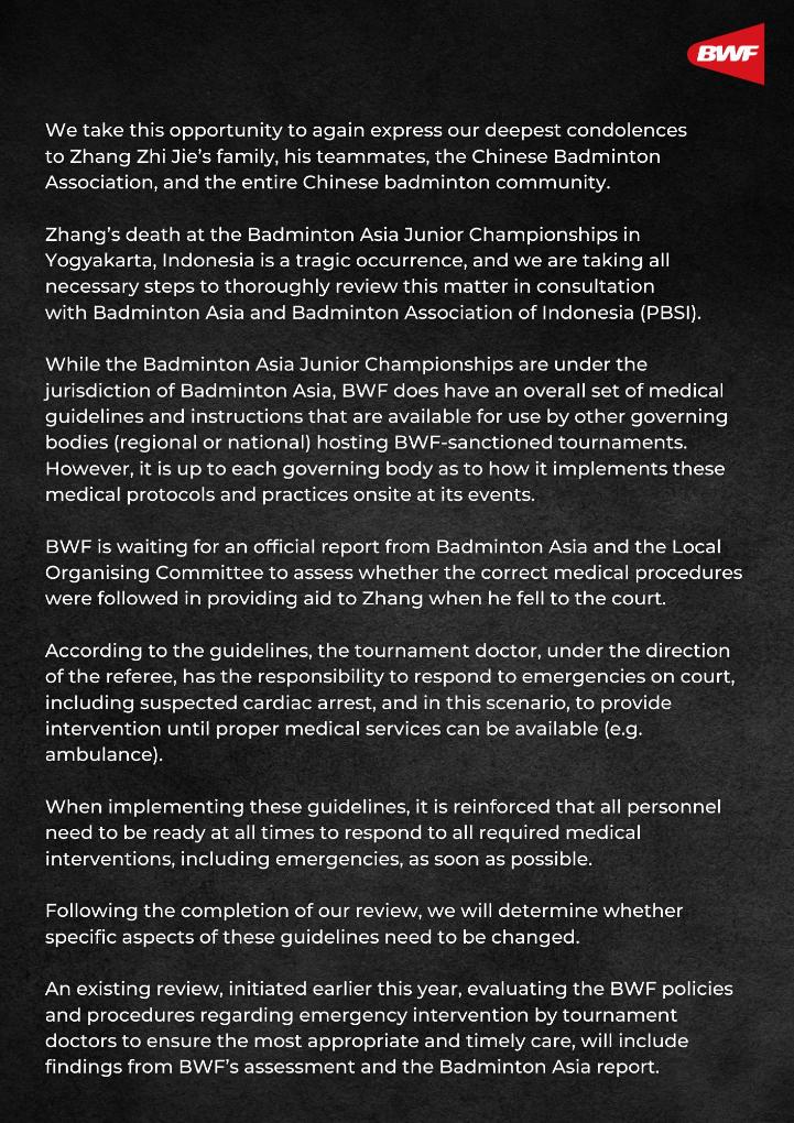 世界羽联表示,其正在等待亚羽联和当地组委会的正式报告,以评估张志杰在球场倒地时,是否遵循了正确的医疗程序。“根据医疗准则,赛事医生在裁判的指导下,有责任应对球场上的紧急情况(包括疑似心脏骤停),并在这种情况下提供干预,直到获得适当的医疗服务(如救护车)。”
