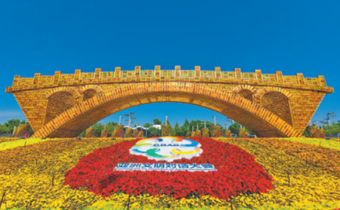 于是,我结合“桥”的意象,以著名的赵州桥为原型,用约两万块融合“一带一路”共建国家国花的“琥珀金砖”,创作了大型公共艺术作品《丝路金桥》。这件作品成为“一带一路”国际合作高峰论坛、首届亚洲文明对话大会等重要主场外交活动主会场的标志性景观,以艺术语言向世界描绘了“一花独放不是春,百花齐放春满园”的和美景象,诗意地呈现了中国“和”文化的美好,传递出和平合作、开放包容、互学互鉴、互利共赢的丝路精神。