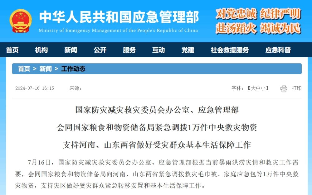7月16日,国家防灾减灾救灾委员会办公室、应急管理部根据当前暴雨洪涝灾情和救灾工作需要,会同国家粮食和物资储备局向河南、山东两省紧急调拨救灾毛巾被、家庭应急包等1万件中央救灾物资,支持灾区做好受灾群众紧急转移安置和基本生活保障工作。