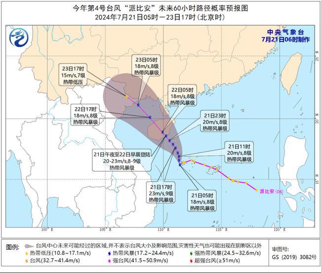 大风预报:7月21日08时至22日08时,南海大部、北部湾、广东西部沿海、海南岛沿海、中沙群岛、西沙群岛、南沙群岛将有6-7级风,阵风可达8-9级,“派比安”中心经过的附近海面和地区风力可达8-9级,阵风10级。