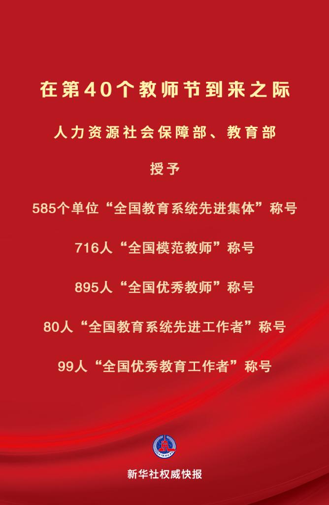在中华人民共和国成立75周年和第40个教师节到来之际,为大力弘扬教育家精神,营造全社会尊师重教浓厚氛围,激励全国广大教师和教育工作者落实立德树人根本任务,积极投身教育强国建设,人力资源社会保障部、教育部决定授予中央财经大学金融学院等585个单位“全国教育系统先进集体”称号;授予刁荣春等716名同志“全国模范教师”称号;授予于渊等895名同志“全国优秀教师”称号;授予王彦平等80名同志“全国教育系统先进工作者”称号;授予王军等99名同志“全国优秀教育工作者”称号。