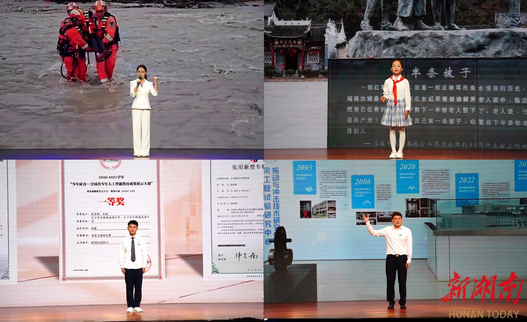 报告会分为缅怀革命先辈、礼赞英雄模范、争做时代新人三个篇章。陈艳、张颖、艾爱国、万步炎、汤洪波、周晓艳、朱祺、陈清杨、张吉仁等报告团成员先后讲述了湘籍老一辈革命家、英雄烈士的祟高理想和坚定信念;讲述了英雄模范代表热爱本职、敬业奉献、创新创造、服务人民的奋斗历程;讲述了青少年代表在新时代的学习成长经历,展现了时代新人的远大理想和家国情怀。
