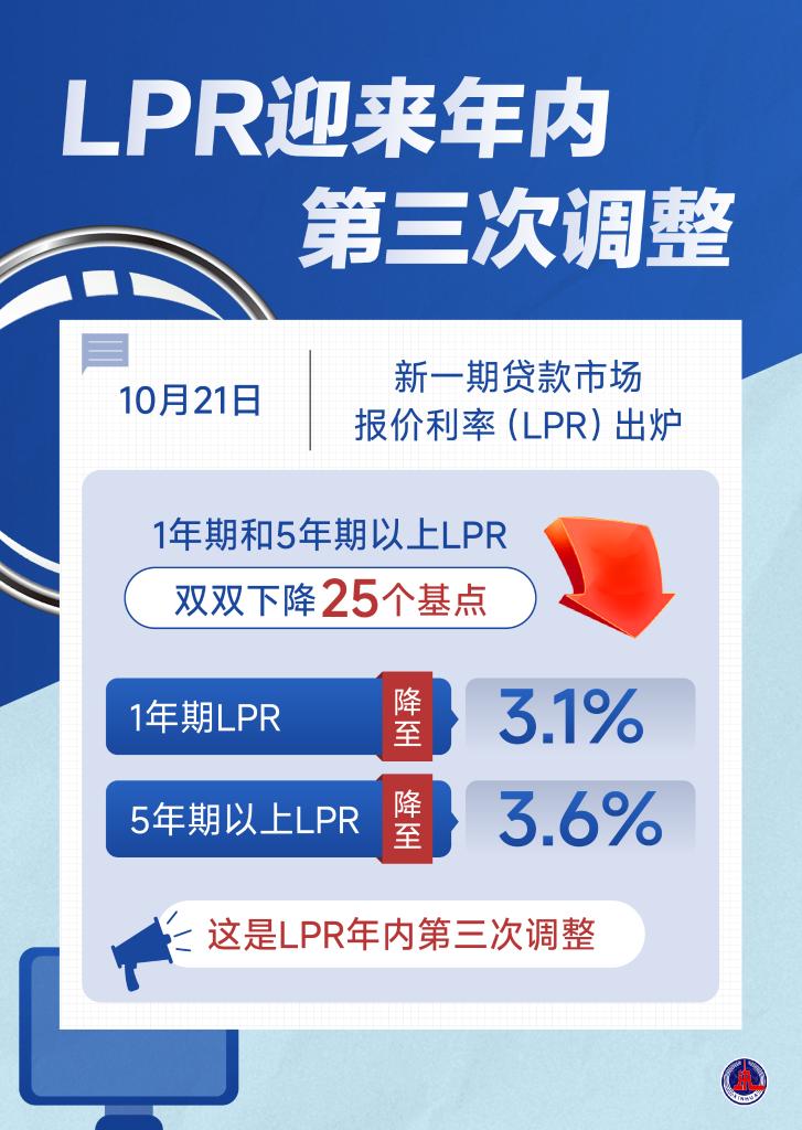 10月21日,新一期贷款市场报价利率(LPR)发布,1年期和5年期以上LPR双双下降25个基点,1年期LPR降至3.1%,5年期以上LPR降至3.6%。