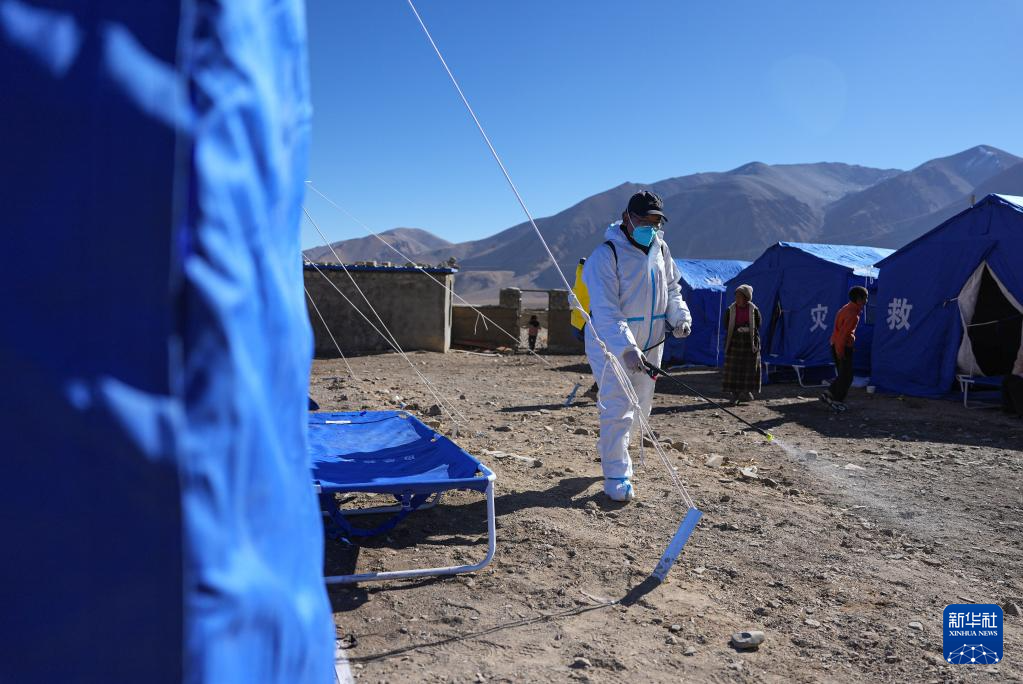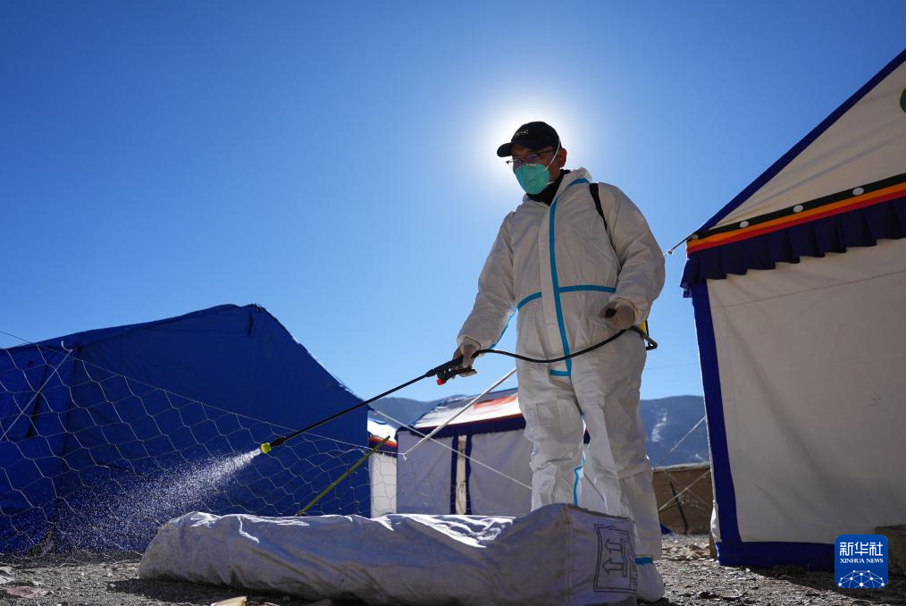 1月8日,医护人员在日喀则市定日县措果乡野江村进行消杀。新华社记者 晋美多吉 摄