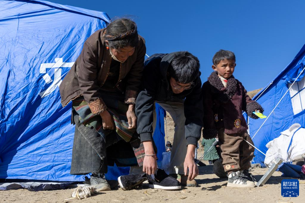 1月8日,在日喀则市定日县长所乡古荣村安置点,一名大学生志愿者(左二)帮助受灾群众换上保暖的新鞋。新华社记者 姜帆 摄