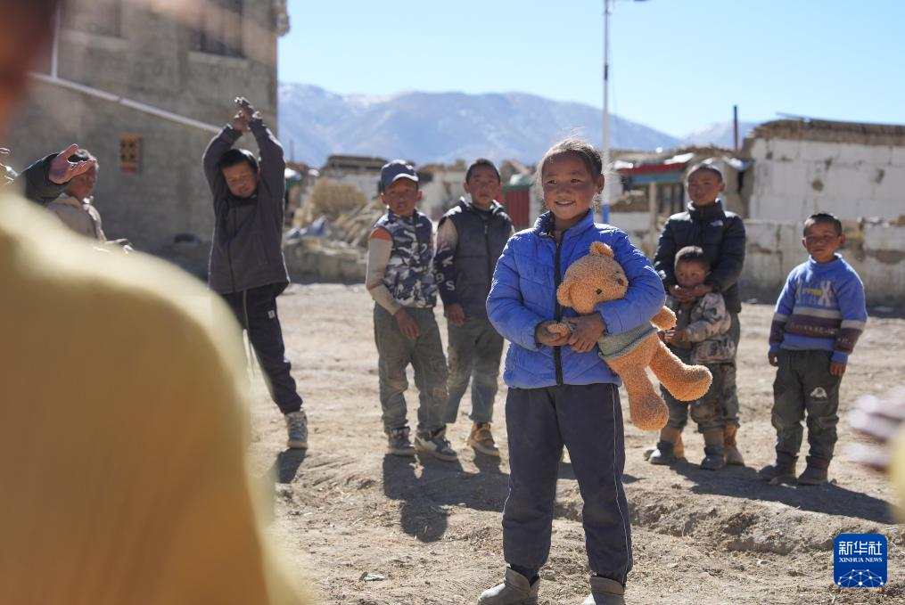 1月8日,在日喀则市定日县措果乡塘仁村地震灾后安置点,西藏星光社会工作服务中心社工向孩子们赠送玩偶熊,并给他们表演节目。新华社记者 晋美多吉 摄