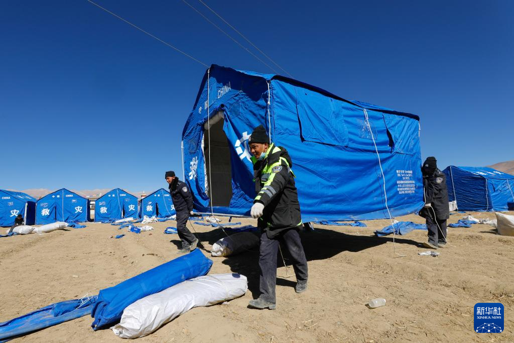 1月8日,在日喀则市定日县措果乡雪珠村安置点,救援人员帮助受灾群众搭建帐篷。新华社记者 沈伯韩 摄