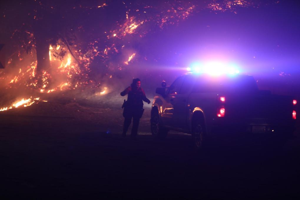 1月7日,一名警察在美国加利福尼亚州南部洛杉矶县沿海社区帕西菲克帕利塞兹的野火旁工作。新华社发(邱晨摄)