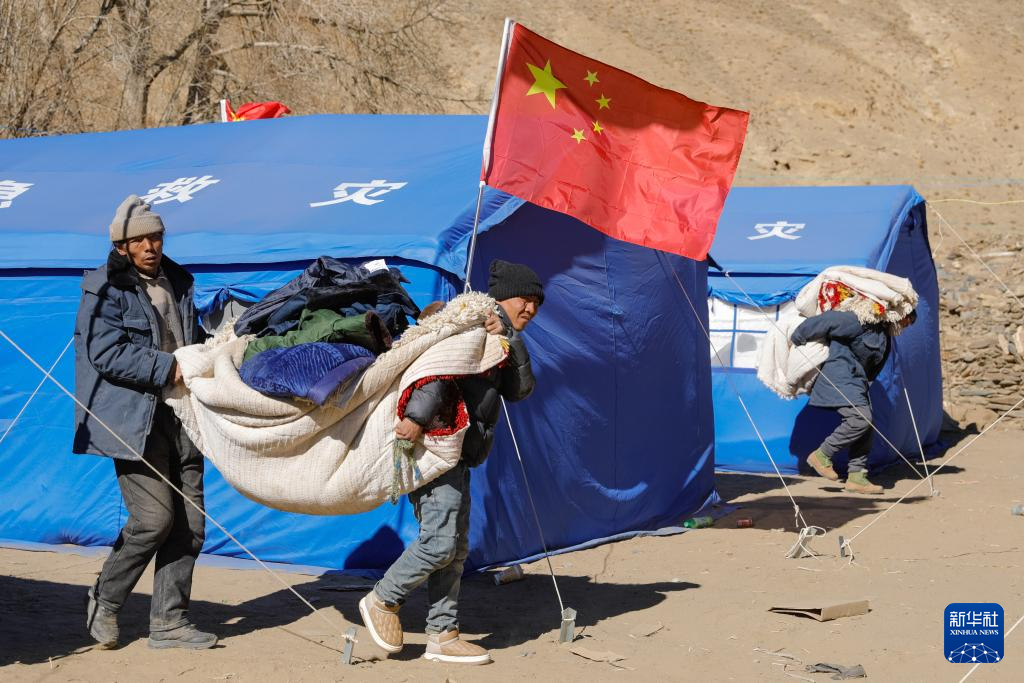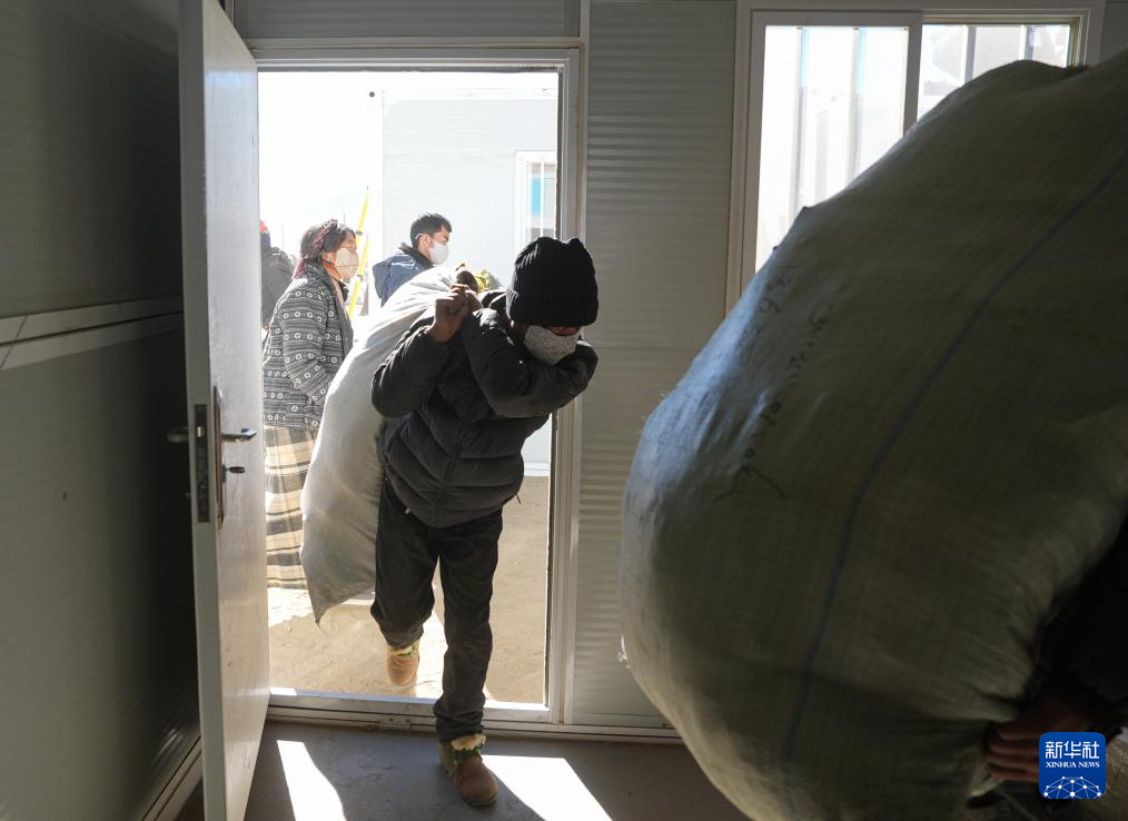 1月10日,在定日县长所乡古荣村,受灾群众在将帐篷内的物资搬入板房。新华社记者 晋美多吉 摄