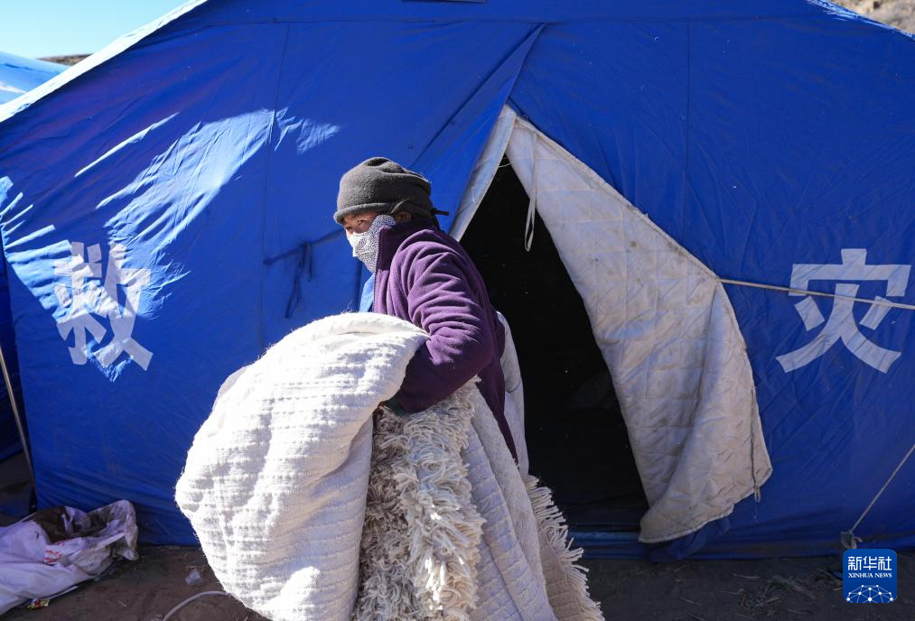 1月10日,在定日县长所乡古荣村,受灾群众准备将个人物品从临时安置帐篷搬入板房。新华社记者 沈伯韩 摄