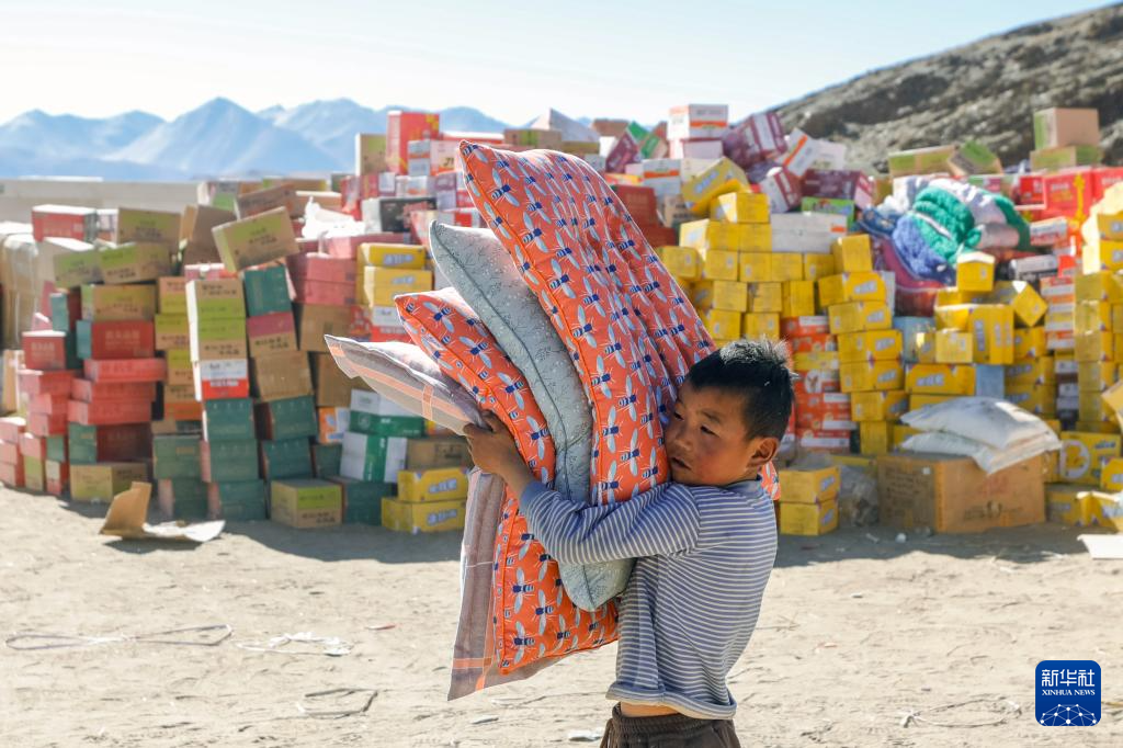 1月10日,在定日县长所乡古荣村,一名男孩抱着领取到的过冬物资,从临时安置帐篷搬入板房。新华社记者 沈伯韩 摄
