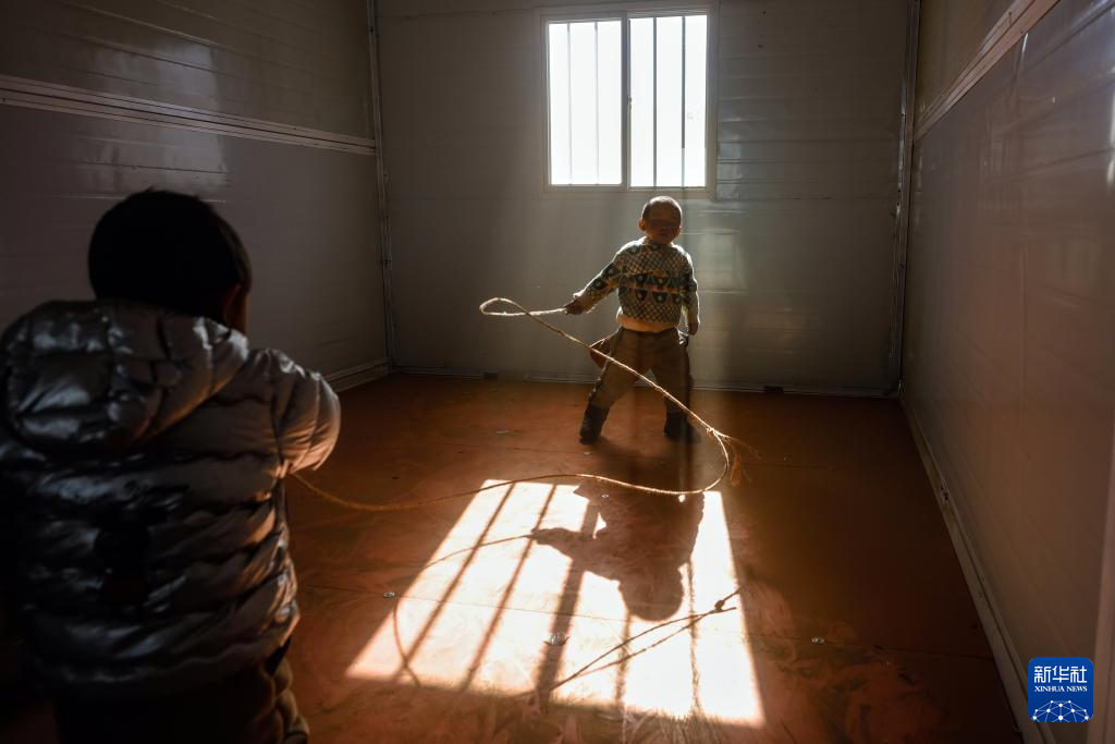1月10日,在定日县长所乡古荣村,两名小朋友在板房内玩耍。新华社记者 沈伯韩 摄