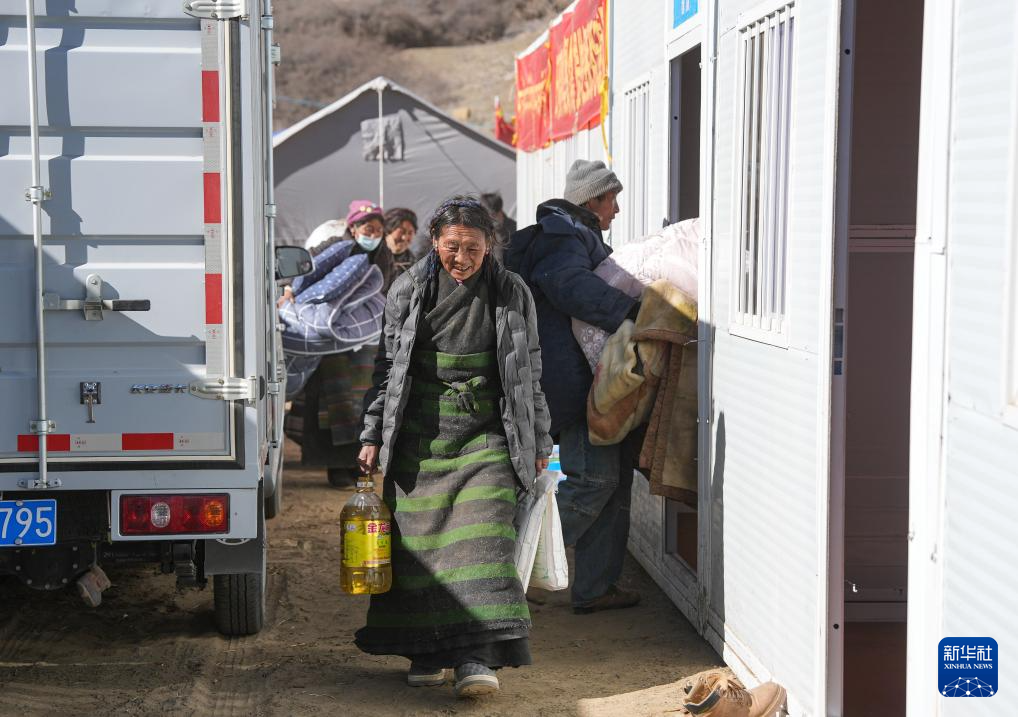 1月10日,在定日县长所乡古荣村,受灾群众将过冬物资从临时安置帐篷搬入板房。新华社记者 沈伯韩 摄
