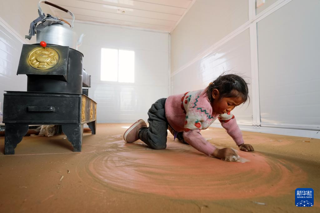 1月10日,在定日县长所乡古荣村,一名小朋友搬入板房后帮助家人清理板房地板。新华社记者 沈伯韩 摄