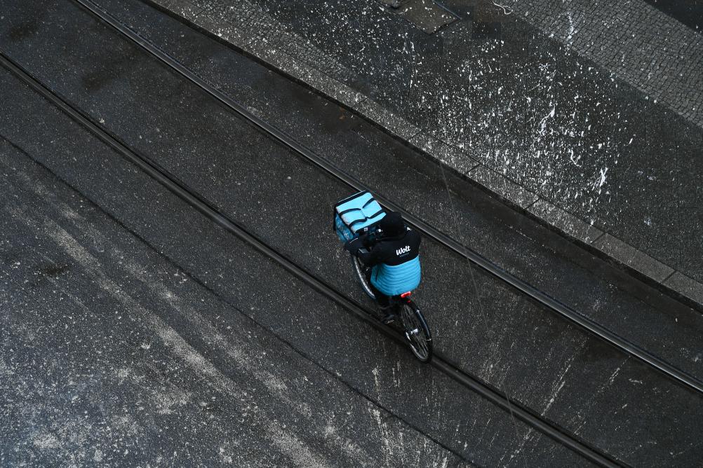 2024年1月15日,一名外卖送餐员骑行在德国柏林市区。新华社记者 任鹏飞 摄