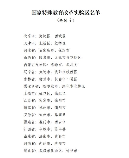 记者2月10日从教育部获悉,经各地自主申报、省级推荐、网络公示等环节,认定北京市海淀区等61个国家特殊教育改革实验区。