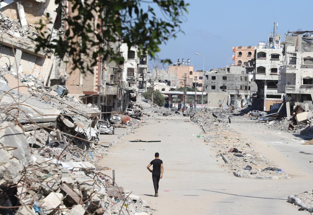 2024年10月9日,在加沙地带北部杰巴利耶,一名男子从建筑废墟旁走过。新华社发(阿卜杜勒拉赫曼·萨拉马摄)