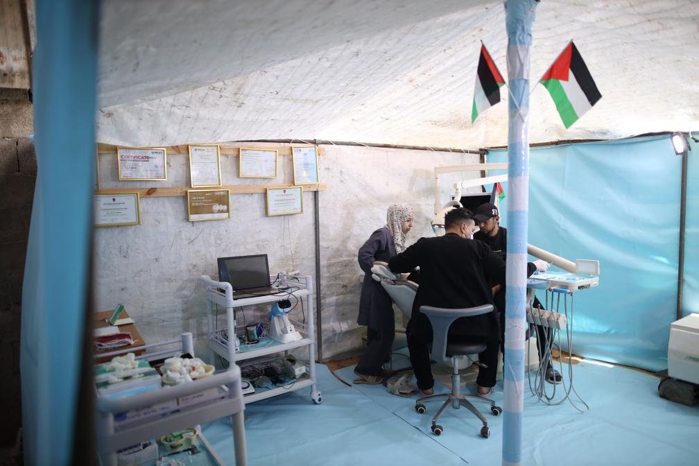 2024年3月30日,在加沙地带的一家临时诊所,牙科医生为患者看病。新华社发