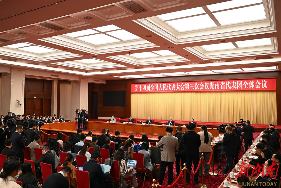 (3月7日,湖南代表团在驻地举行第三次全体会议,并向中外媒体开放。)