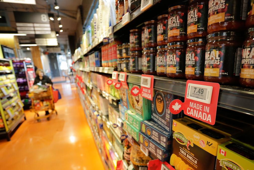 2月25日,在加拿大温哥华一家超市内,加拿大商品的旁边贴着印有“加拿大制造”的标签。加拿大近日采取措施加大了对于本土产品的推广力度,以应对美国关税威胁。新华社发(梁森摄)