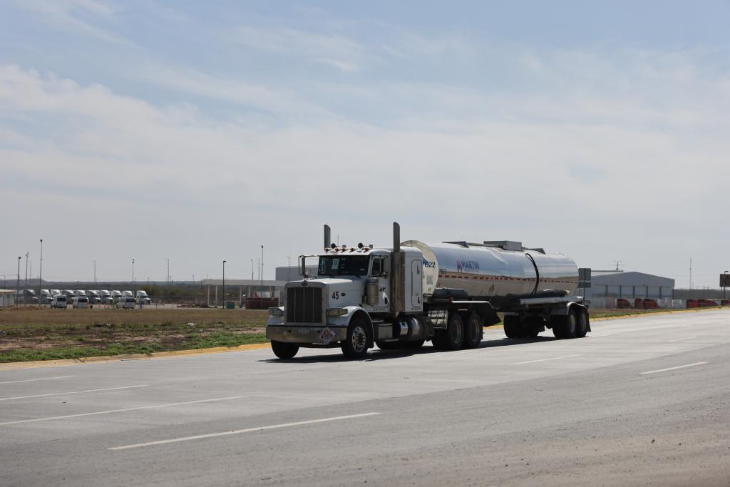 2月15日,在墨西哥新莱昂州哥伦比亚镇,货车在墨美边境附近的公路上行驶。新华社记者 李梦馨 摄