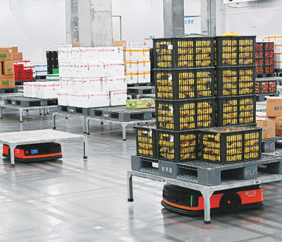 近年来,湖北省襄阳市依托大数据、云计算及人工智能等技术,实现物流运作的规模化、集约化和智慧化。图为在襄阳市樊城区好邻居生鲜物流中心,两台智能运送机器人在货物运送轨道上相遇后,按优先级先后通过。新华社记者 黄晓勇摄