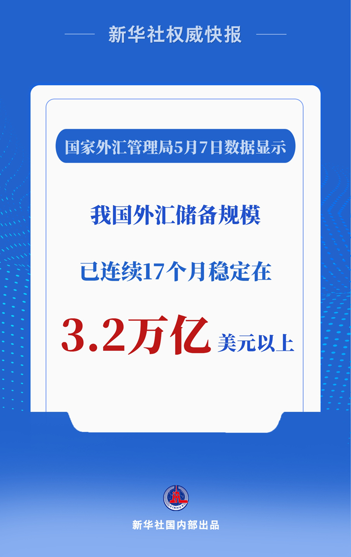 新华社北京5月7日电(记者张千千、刘开雄)国家外汇管理局7日公布的统计数据显示,截至4月末,我国外汇储备规模为32817亿美元,较3月末上升410亿美元,升幅为1.27%,已连续17个月稳定在3.2万亿美元以上。