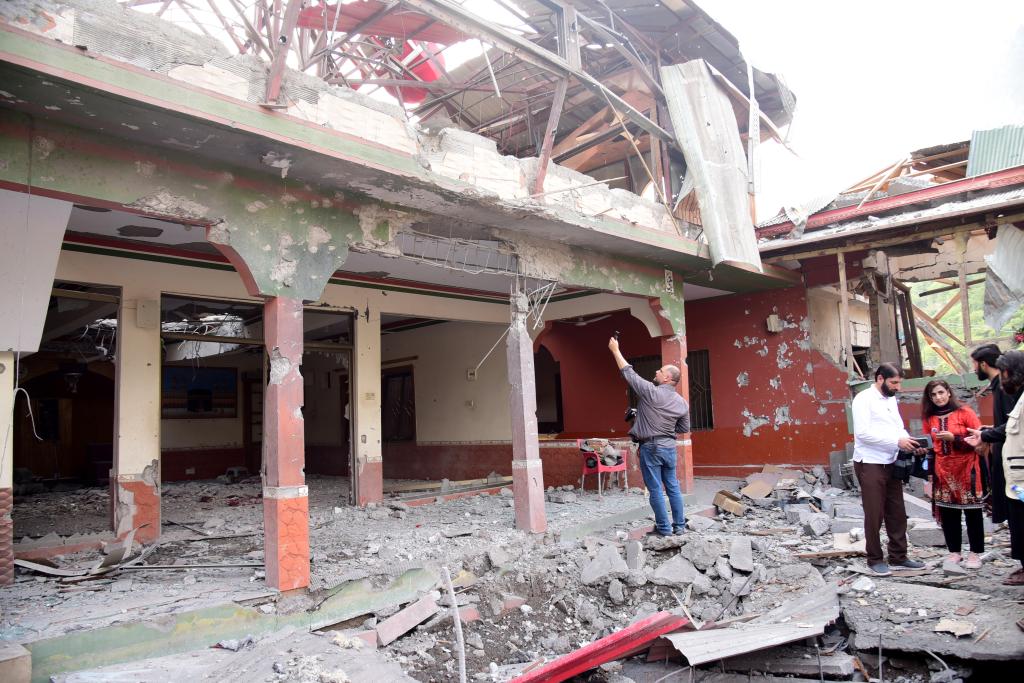 5月7日,在巴控克什米尔地区首府穆扎法拉巴德,人们在一幢遭印度空袭的建筑内查看损失情况。新华社发(穆罕默德·丁·穆加尔摄)