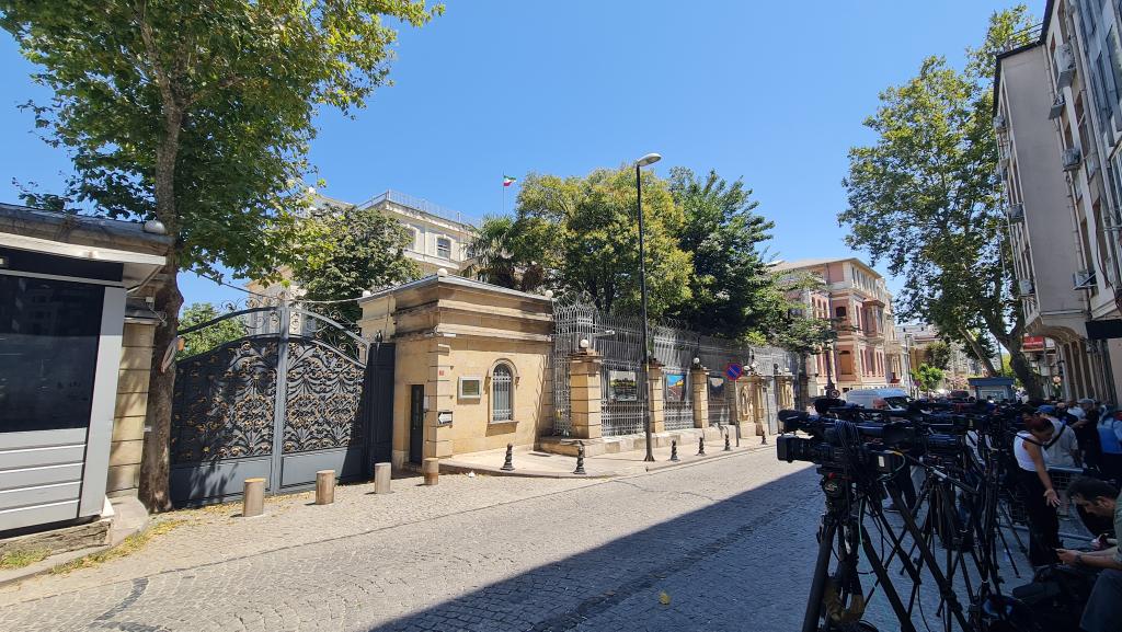 7月25日,伊朗与英国、法国和德国在土耳其伊斯坦布尔举行会谈,就伊核协议的履行以及相关制裁问题交换了意见。媒体人员在举行会谈的伊朗驻伊斯坦布尔总领事馆外蹲守。新华社发(萨法尔·拉贾博夫摄)