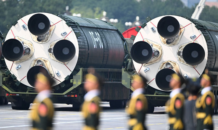 ↑9月3日,纪念中国人民抗日战争暨世界反法西斯战争胜利80周年大会在北京隆重举行。这是核导弹第二方队接受检阅。新华社记者 杨冠宇 摄