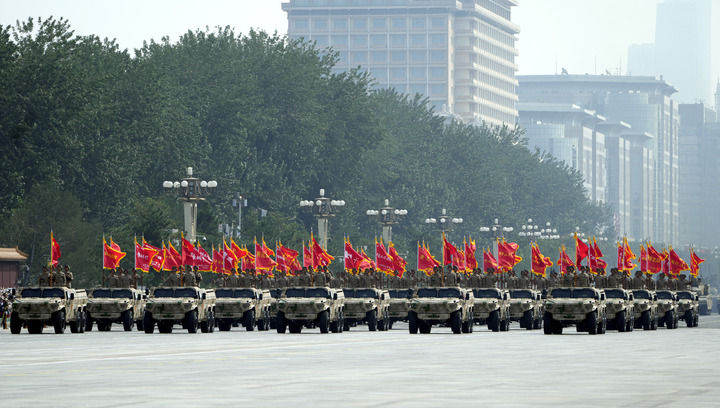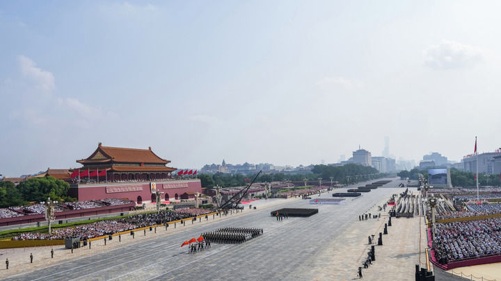 ↑9月3日,纪念中国人民抗日战争暨世界反法西斯战争胜利80周年大会在北京隆重举行。这是信息支援部队方队通过天安门广场。新华社记者 陈益宸 摄