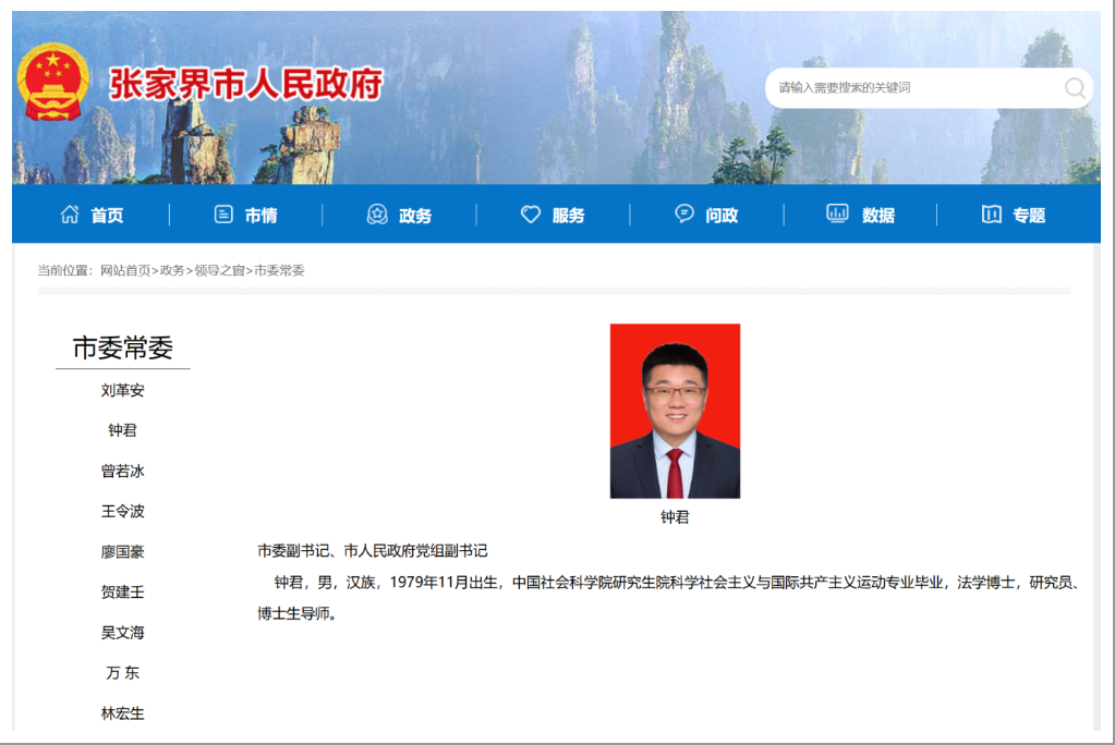 日前更新的张家界市人民政府网站“领导之窗”栏目显示,钟君已任张家界市委副书记、市人民政府党组副书记。